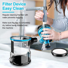 Dulkių talpą ir filtrą lengva išimti ir plauti. Aukštos kokybės kempininis filtras apsaugo nuo užsikimšimų ir tarnauja ilgiau nei įprasti HEPA filtrai. Prieš naudojimą būtina visiškai išdžiovinti.