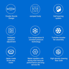 Purškimo antgaliai gali sudaryti 15 μm vandens rūką, todėl valant būtų lengva ištirpinti nešvarumus ir dulkes. Langų valymo robotas turi efektingai valančias šluostes, kurios išvalys ne tik dulkes, bet ir kitus net įsisenėjusius nešvarumus.