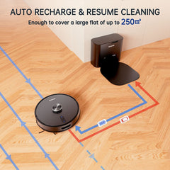 Universalus valymas ir savaiminė priežiūra – iki 200 min darbo laikas, vienu įkrovimu išvalo iki 250 m². Esant 15 % baterijos likučiui robotas pats grįžta į stotelę ir pasikrovęs iki 80 % tęsia valymą. Įrenginys palaiko iki 5 žemėlapių atmintį (tinka daugiabučiams). Įveikia 1,8 cm slenksčius. Komplekte: 2 plovimo šluostės, 2 filtrai, 6 l dulkių maišelis.