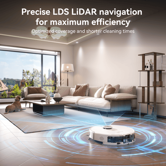 Priekiniai ir šoniniai jutikliai tiksliai aptinka ir vengia kliūčių, leidžia robotui valyti iki pat kraštų, net ir po spintelėmis ar prie grindjuosčių. Veikia su Alexa, Google Home ir Siri – patogu valdyti balsu.