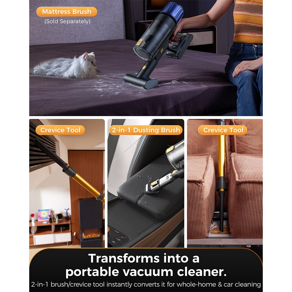Dėl galingo bešepetinio 580 W variklio šis belaidis dulkių siurblys pasiekia iki 50 kPa siurbimo galią. Lengvai pašalina stambias šiukšles, įsisenėjusias grindų dėmes, gyvūnų plaukus ir kilimų pūkus, taip pat dulkes kampuose, tamsiose vietose, ant sienų ir sunkiai pasiekiamose aukštose vietose.